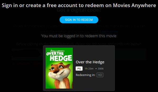 Up for sale is a single redemption HD Movies Anywhere digital movie code for Over the Hedge (2006), redeemable directly into Movies Anywhere.