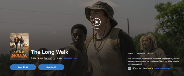 Up for sale is a single redemption 4K Vudu Fandango at Home digital movie code for The Long Walk (2025), redeemable directly into Vudu Fandango at Home.Β