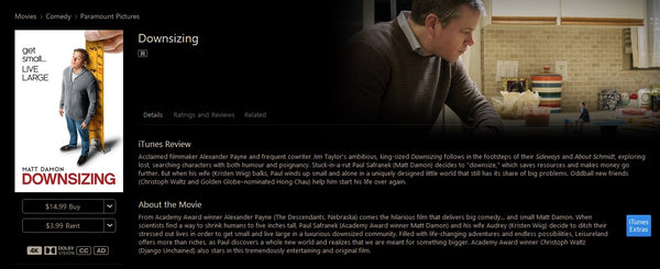 Up for sale is a single redemption 4K iTunes Apple TV digital movie code for Downsizing (2017), redeemable directly into iTunes Apple TV.Β