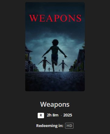 Up for sale is a single redemption HD Movies Anywhere digital movie code for Weapons (2025), redeemable directly into Movies Anywhere.