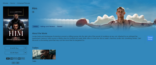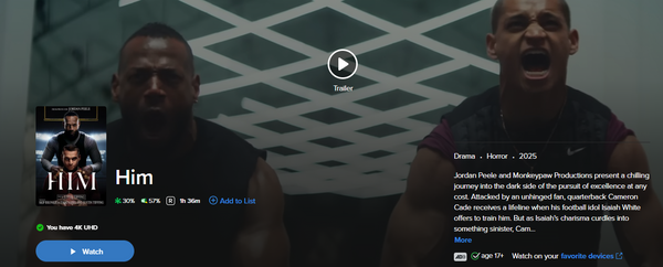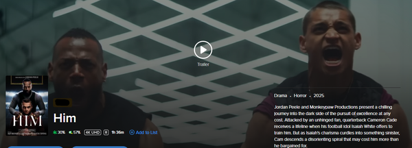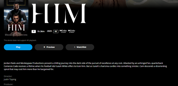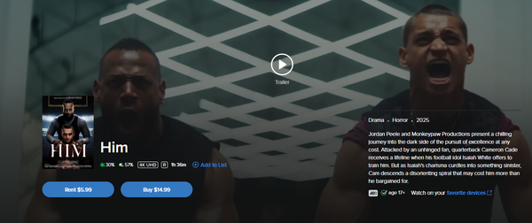 Up for sale is a single redemption 4K Movies Anywhere digital movie code for Him (2025), redeemable directly into Movies Anywhere.