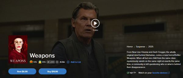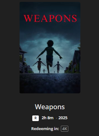 Up for sale is a single redemption 4K Movies Anywhere digital movie code for Weapons (2025),Β redeemable directly into Movies Anywhere.