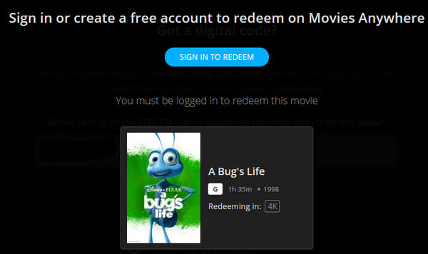 Up for sale is a single redemption 4K Movies Anywhere digital movie code for A Bug's Life (1998), redeemable directly into Movies Anywhere.
