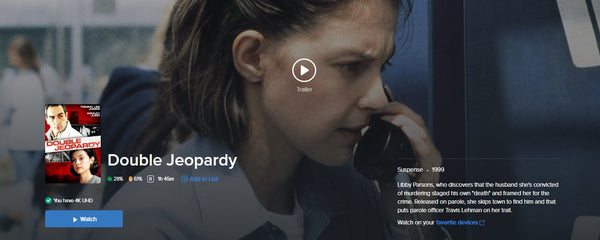 Up for sale is a single redemption 4K Vudu Fandango at Home digital movie code for Double Jeopardy (1999), redeemable directly into Vudu Fandango at Home.Β
