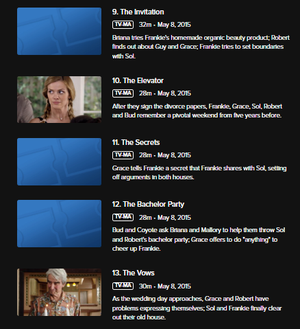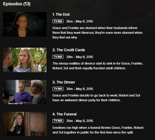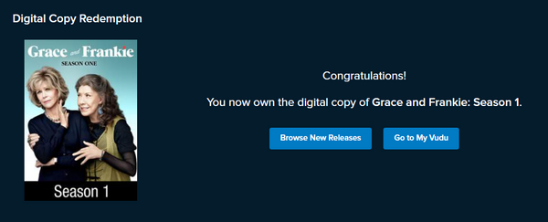 Up for sale is a single redemption SD Vudu Fandango at Home digital television code for Grace and Frankie Season 1 (2015), redeemable directly into Vudu Fandango at Home. This contains all 13 episodes of the season.