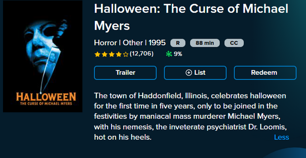 Up for sale is a single redemption HDX Vudu Fandango at Home digital movie code for Halloween: The Curse of Michael Myers (1995 theatrical version), redeemable directly into Vudu Fandango at Home.