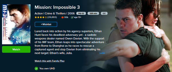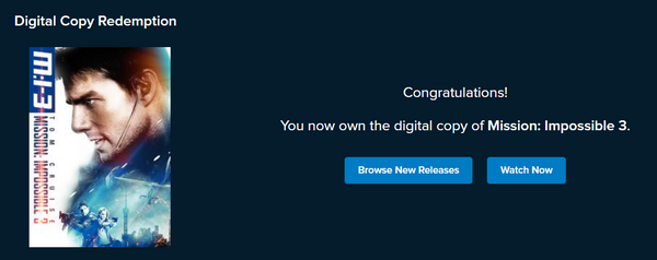 Up for sale is a single redemption 4K Vudu Fandango at Home digital movie code for Mission: Impossible 3 (2006), redeemable directly into Vudu Fandango at Home.