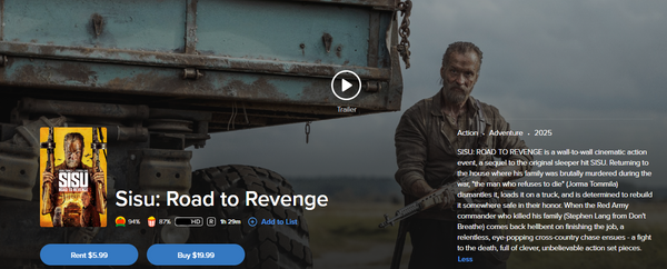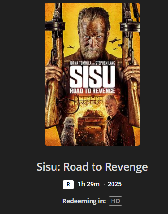 Sisu: Road to Revenge HD Digital Code (2025) (Redeems in Movies Anywhere; HDX Vudu Fandango at Home & HD iTunes Apple TV Transfer From Movies Anywhere)